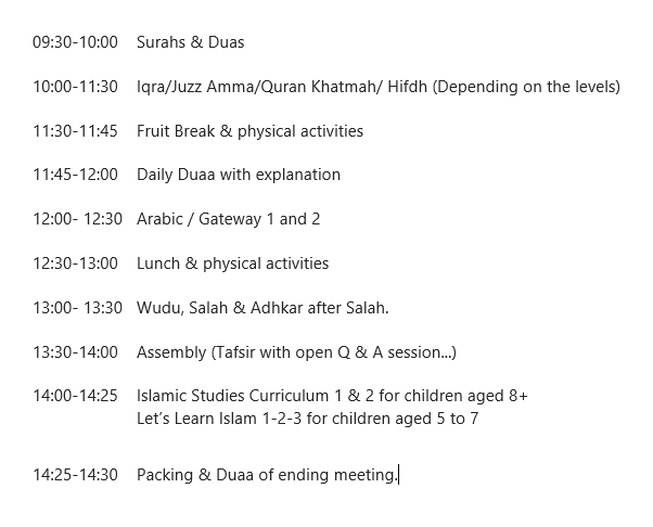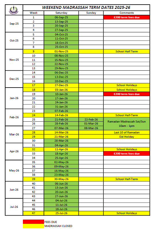 The Weekend Madrassah runs on Saturdays only, during school term time, from 9.30am to 2.30pm.
